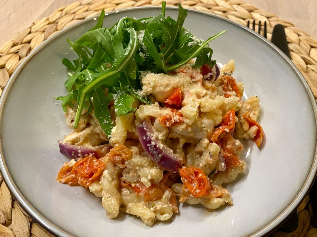 Detta är en twist på en av de största succéerna hittills på internet: gratinerad feta-pasta. Här tillagad med fullkornspasta för mycket kostfiber och en massa tomater för en rejäl dos antioxidanter. Supergott!
